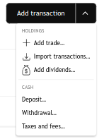 要添加现金交易,请点击投资组合页面右上角“添加交易”右侧的下拉菜单,然后选择相应的现金交易类型。