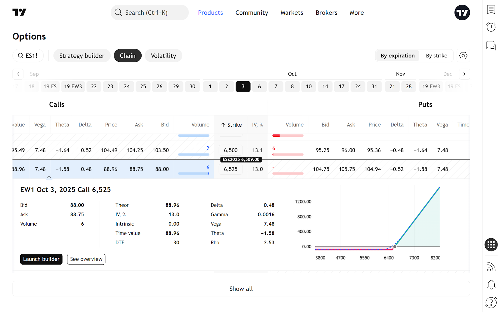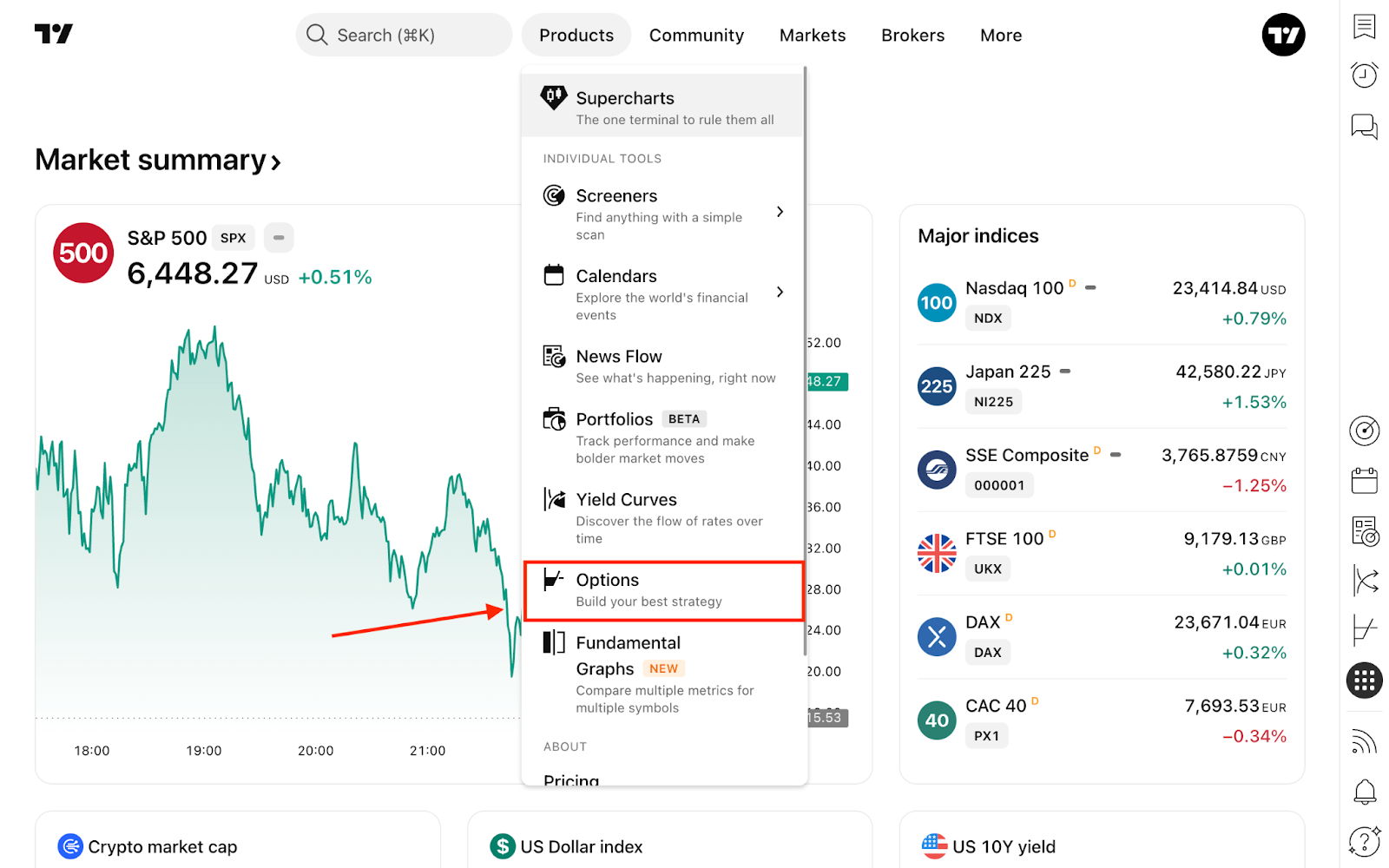 在 TradingView 的任何页面上,将鼠标悬停在“产品”下拉菜单上,然后选择“期权”。