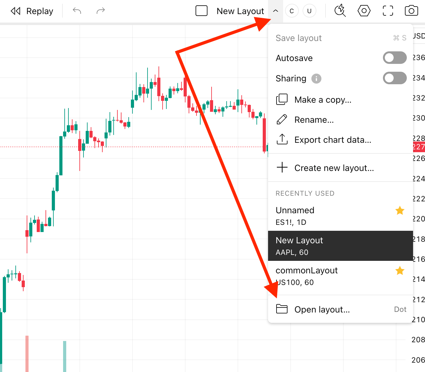 如何查看所有已保存的布局?要查看所有已保存的布局,请打开布局下拉菜单,然后点击“打开布局”按钮。或者,您也可以使用 Dot 快捷键。之前之前如何删除布局?接下来接下来我不小心删除了布局,可以恢复吗?开启超级图表