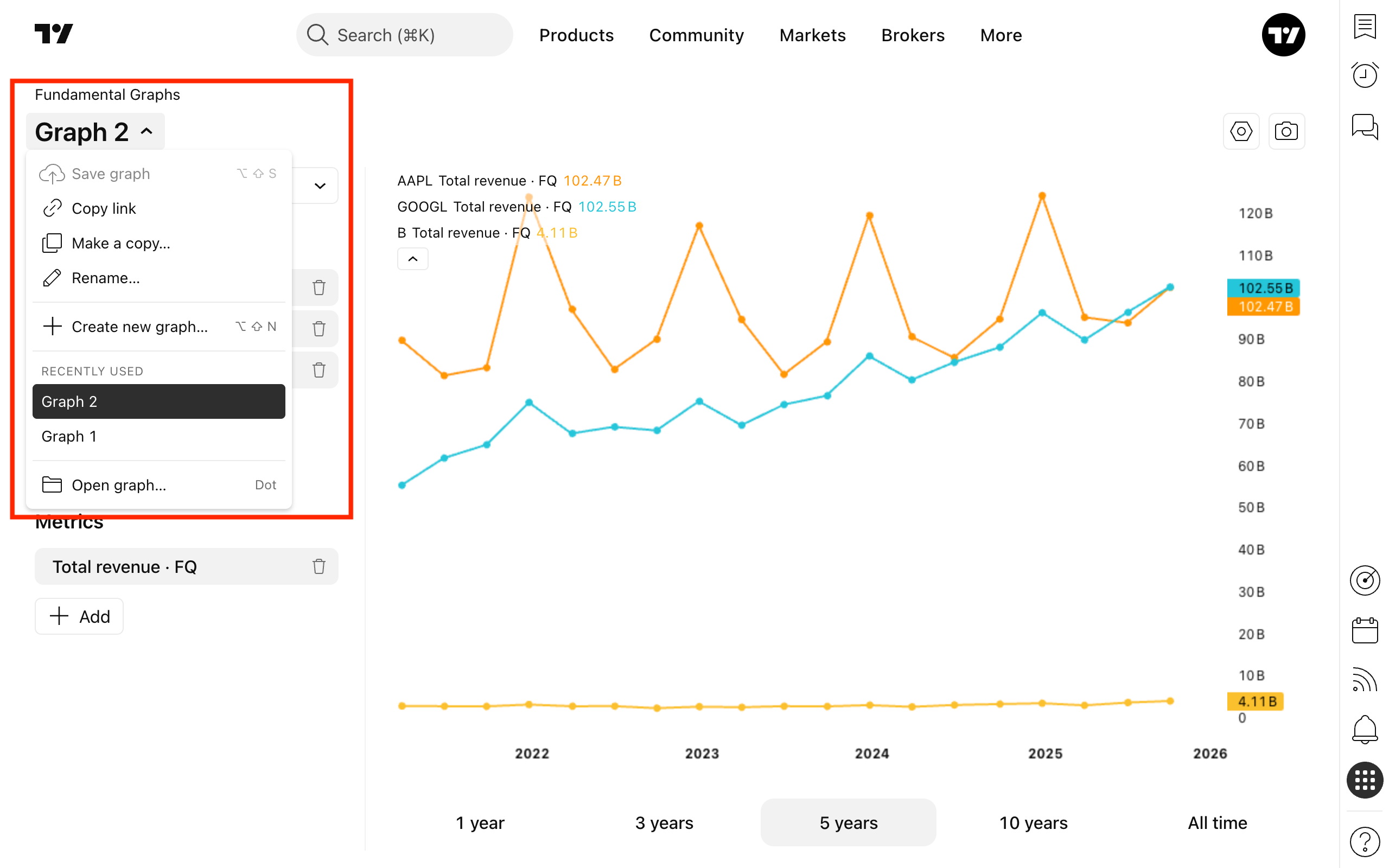 您可以保存、编辑、复制和分享您的基本面图表。为此,请使用页面左上角的控制面板,点击图表名称即可打开该面板。菜单可让您快速访问最近使用的图表;要查看完整列表,请点击“打开图表…”。