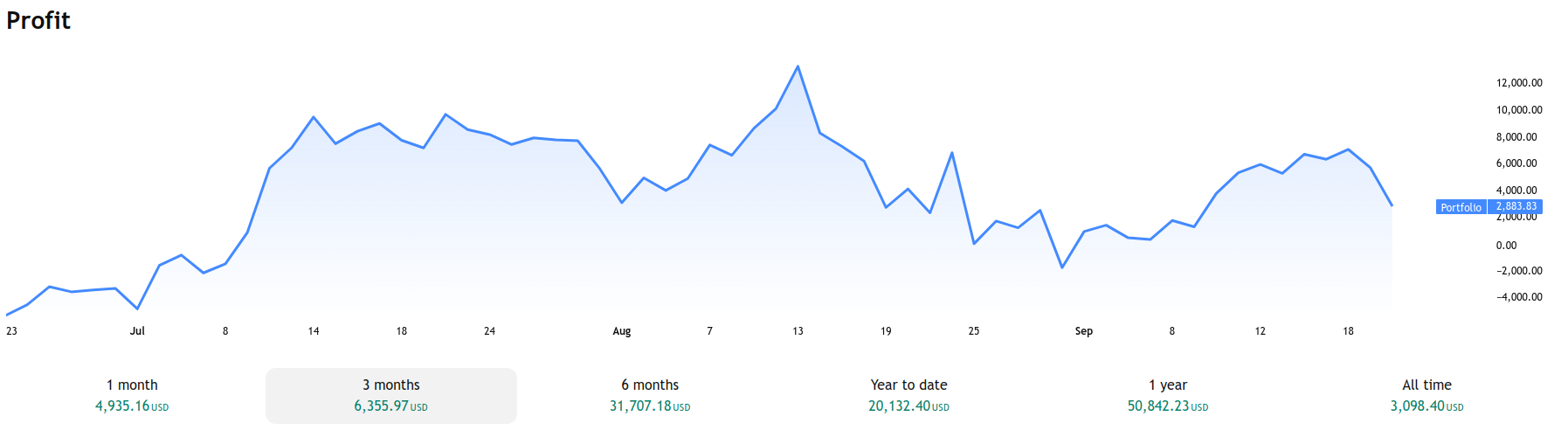 此图表展示了您的投资组合总收益随时间的变化。图中线条代表以投资组合货币计价的累计利润,突显了持续增长和短期波动。