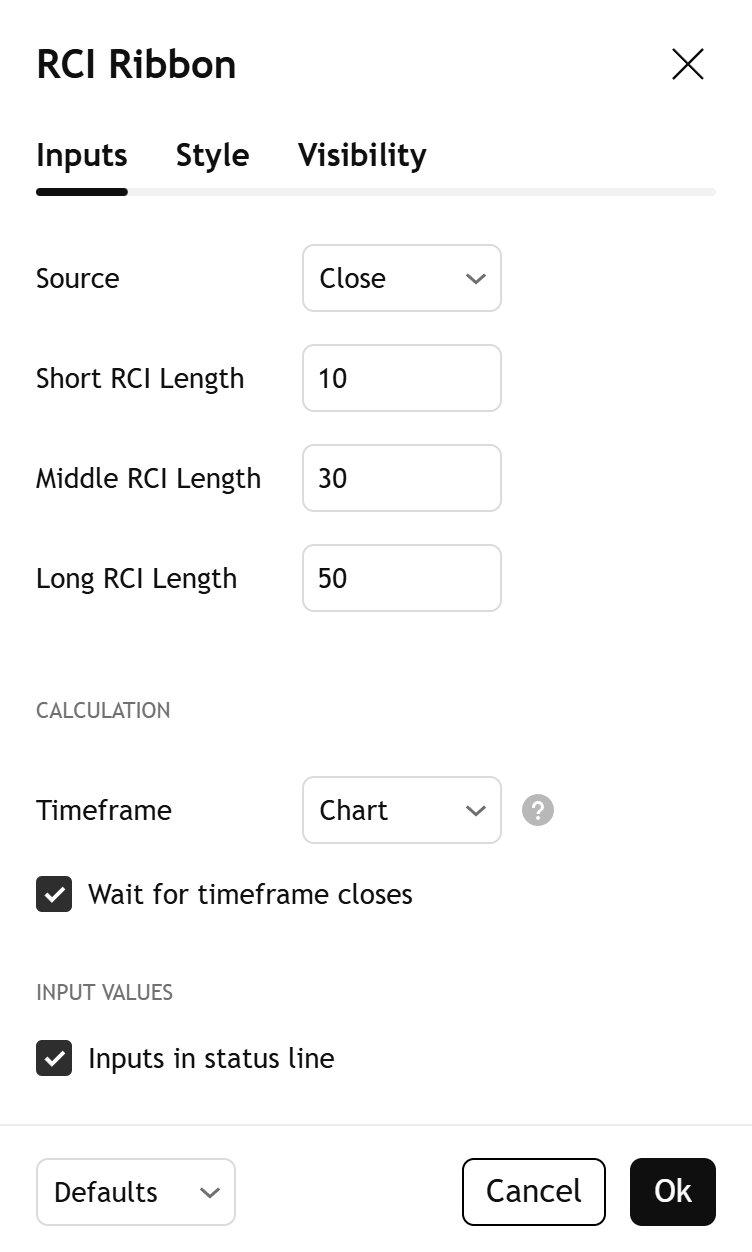 RCI Ribbon的计算方法与标准RCI相同。每个震荡指标代表在指定回溯周期内,价格与K线指数之间Spearman等级相关系数的缩放版本。为了计算RCI值,该指标执行以下操作: