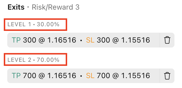 在多个止盈止损水平配置对话框中,您可以点击垃圾桶图标删除特定水平。点击已配置水平的按钮即可编辑其参数。