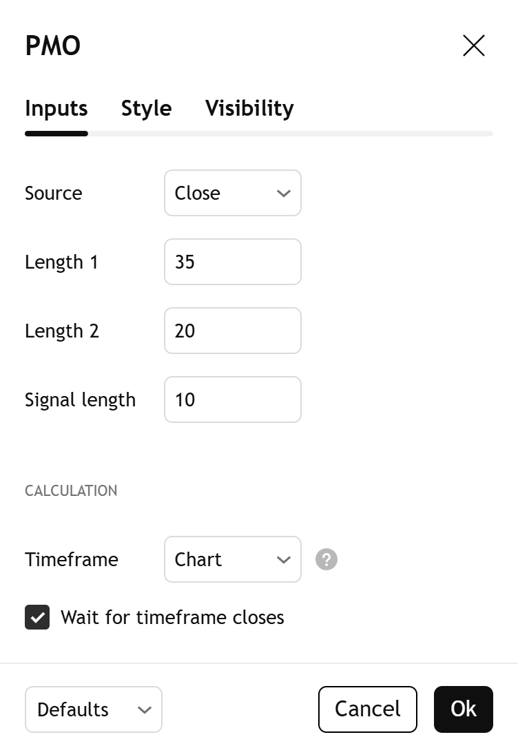 PMO 指标对市场价格的单根K线 ROC 应用两阶段不同长度的自定义指数平滑处理。然后,它使用标准 EMA 计算信号线。计算 PMO 和信号值的步骤如下: