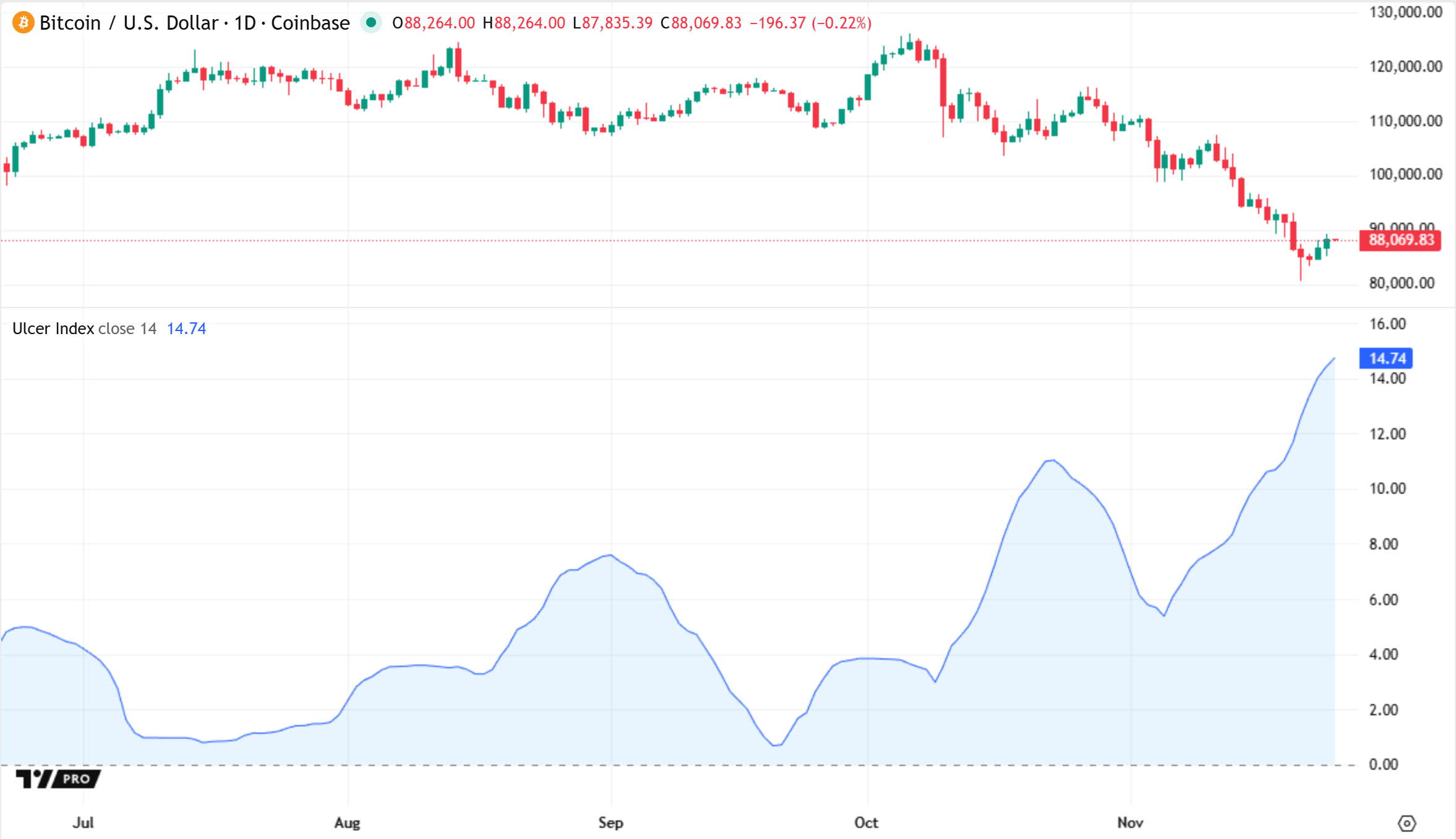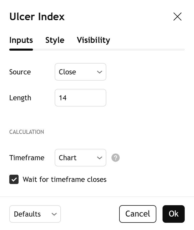与标准差等同时反映上涨和下跌波动率(风险)的波动率指标不同,溃疡指数仅关注价格回撤,从而提供下行波动率的估计值,用于评估多头仓位。交易者通常使用溃疡指数来分析某个金融工具的下行风险,并比较不同金融水平的风险水平。