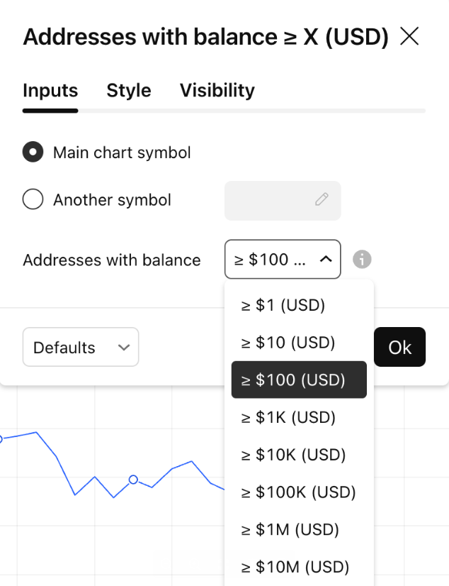 “余额 ≥ X 美元的地址”的计算方法是统计满足以下条件的唯一地址:(余额 × 当前美元价格)≥ X。用户可以在指标设置中调整 X 参数,以分析不同经济层级的持有者。